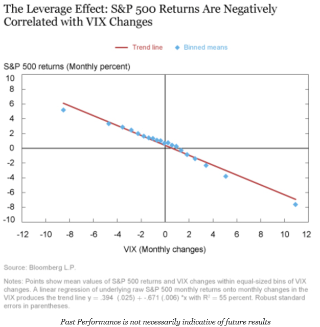 We believe that a volatility shock will generate a feedback loop that will force equity prices lower. High leverage tied to volatility targeted risk management will mean that any increase in volatility will lead to portfolio rebalancing and position cutting. This negatively correlated leverage effect between equity returns and change in the VIX is real, as measured by researchers at the New York Fed, see “The Low Volatility Puzzle: Are Investors Complacent?“.