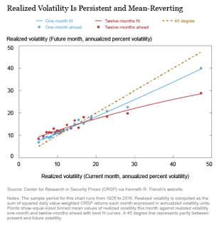 There is mean reversion but it is slow. Low or high volatility will not persist but the adjustment period is long. There is also limited evidence that there will be a jump in volatility when it is low. Finally the volatility term premium has persisted to be higher for longer horizons which suggests that the market still views volatility will be higher in the longer-run. The data show that a volatility spike is not embedded in fact that current volatility is low.