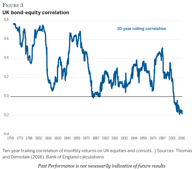 The bond diversification story is based on the strong negative correlation between stocks and bonds that has existed for over a decade, yet it is not a given that stocks and bond returns will move in opposite directions. A quick look at a very long history from a Wellington Management chart tells us that the negative correlation is the exception not the rule.