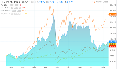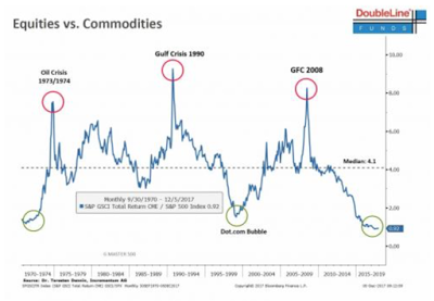 Equities are overvalued! Bonds are overvalued! In the minds of many investors everything is overvalued given central bank distortions, yet there may be an exception. Look at commodities. The difference between financial and real asset could not be larger. Financial assets have steadily moved higher while commodities have fallen or at best moved sideways relative to risky stocks in the last 5+ years. This relationship has applied to all equity indices around the world to varying degrees.