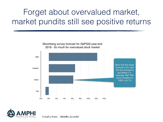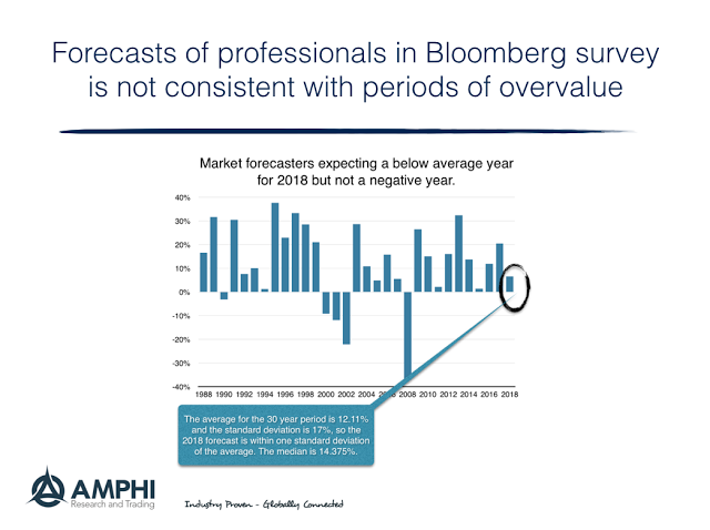 Perhaps the market analysts making 2018 forecasts for the S&P500 did not get the memo on valuation. The equity markets are overvalued by most any measure, yet the median forecast is still expecting a 6% total return in the year-end Bloomberg survey.