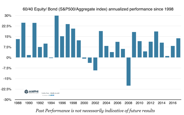 For many investors, there has been a strong adherence to the 60/40 mantra. The mantra says that 60/40 will protect an investor in a downturn and provide strong risk-adjusted returns in all environments. There can be variations on this theme, but 60/40 has often served as the core allocation for many investors. For 2017 this portfolio combination was again a winner. The 60/40 SPY/AGG (using index total returns) combination generated a return of 13.74% in 2017 which was above the average of 9.86% for the last 30 years.