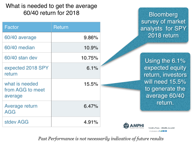 We used the average forecast for 2018 equity returns (SPY) from a Bloomberg survey as a base equity number and worked backwards to calculate the returns necessary from the AGG index to generate the average annual 60/40 return over the last 30 years. In this case, the Aggregate index would have to generate over 15% next year. That is unlikely to happen. It would be over 2 times the average AGG return and just under 2 standard deviations from the average over the last 30 years. This return would be without the help of the higher currents yields over the last 30 years.