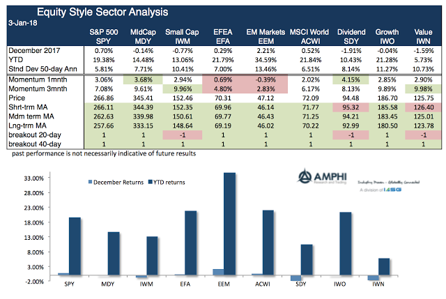 A year-end performance review of styles, sectors, and country index ETFs shows the peaks and valleys for 2017 and what may be ahead in 2018. Overall, this was an especially good year for international investing and holding exposure in emerging markets. Large cap US which has strong international earnings also did well in 2017. Mid and small cap US underperformed during the year in spite of the resurgence in economic growth. The worst performing style was defensive dividend focused. Value underperformed growth by a wide margin.