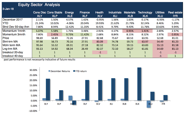 The stronger trend in oil and the concerns about overvalued stocks suggest that the extremes in these sectors may switch in 2018. Cyclical performance should continue based on the economic growth story.