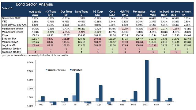 Bond performance was strongest in international and emerging markets based on improved credit risk and dollar weakening. The strong long duration Treasury performance was surprising given the strengthening economic growth. Demand for yield from credit continues albeit less so for the high yield sector. Other bond sectors were flat for the year.