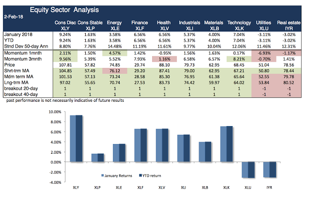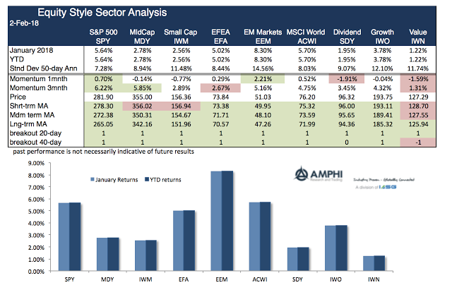 Within our style grouping, there was a fall-off in price relative to the short-term moving average in mid-cap, small caps, and value markets based on declines near the end of the month. Global equities, especially emerging markets, were still the style winner for January.