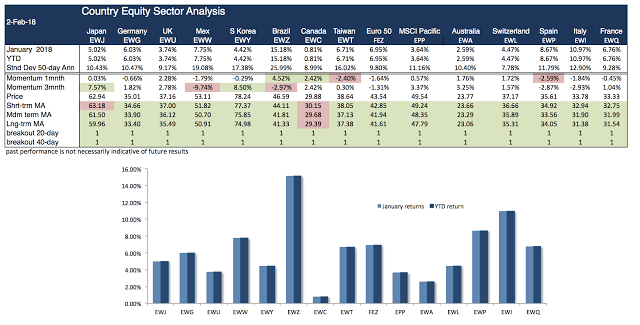 Good gains in Italy, Spain, Brazil and Mexico are consistent with the increases in global growth in emerging markets as well as the eurozone. There should be some concern with future returns in Japan and Canada based on short-term moving averages.