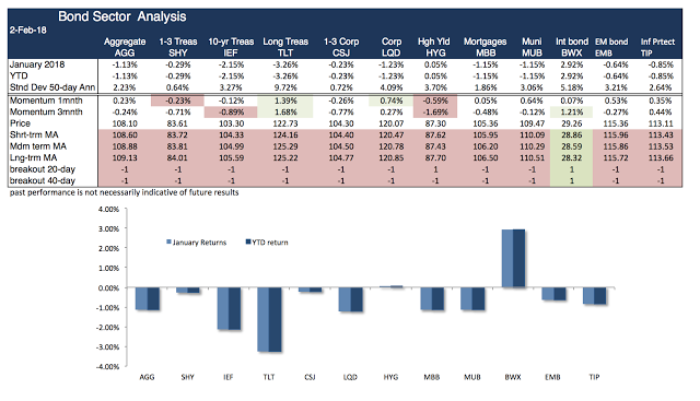 Equities started the year with strong performance across style, sector, and country groupings; however, there were some exceptions to these gains and also some signs of potential for performance declines. Bond ETF returns were all negative except for international bonds which gained from the dollar decline. These returns are consistent the fundamental story of strong growth and expected higher inflation. There will be peak and valley in return even with the clear story, but the general direction is still risk-on for equities and avoidance of duration for bonds.