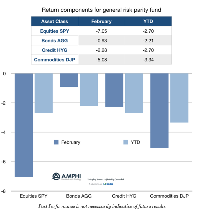 All four major asset classes, equities, bonds, credit and commodities have declined year to date and for February. There was no diversification albeit any allocation away from equities was a relative winner. A quick comparison of volatility changes since the beginning of the year shows a range of increases: from 11% for commodities to 41% for bonds, 123% for high yield credit, and 423% for equities using simple 20-day moving averages.
