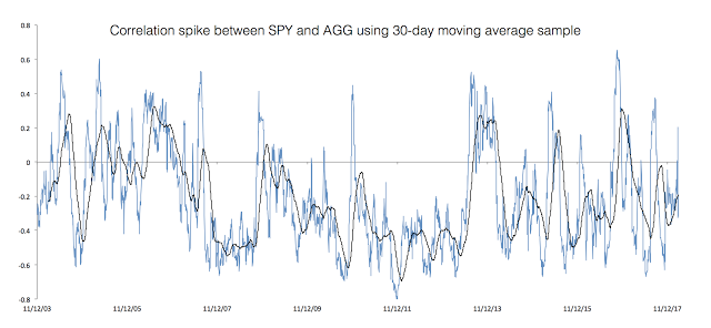 We looked at 30-day rolling correlation as a short-term measure for the period from October 2003 to the present February 2018 between SPY and AGG (the Barclay Aggregate Bond index) ETFs. There has been a spike in correlation but there have been other periods of rising positive correlation.