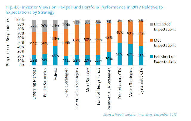About 1/3rd of investors believe that hedge funds have fallen below expectations with a range between 21 and 50 percent. The highest degrees of low expectations are in the CTA and macro strategy categories.