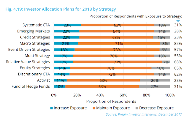 The number one strategy for hedge fund allocations is systematic CTAs followed by emerging markets, credit and macro. These allocation plans exist even with the or because of the fact that expectations for CTAs have fallen short. Still, diversification away from overvalued equities and bonds still seems to be a driver for investment decisions. After the first two months of the year, these plans may be in flux.