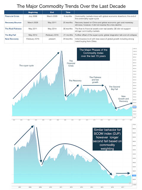If we had to breakdown the behavior of the indices since the Financial Crisis we see four or five major trends. First, there is the pre-Crisis super-cycle which peaked in mid-2008 before the worst of the Financial Crisis. The steep decline was consistent with the economic slowdown that was already occurring before September 2008. The second leg of the major commodity trends for the last 15 years was the financial crisis. All risky assets correlated to one as there was a single factor that was driving the market declines. The third part was the initial recovery after the market bottom in March of 2009 The pre-crisis excess, Financial Crisis fall, and partial recovery are consistent with the behavior of financial assets.