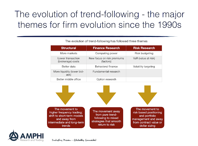 We provide three highly stylized themes that have changed managed futures trend-followers: structural, finance research and risk research. These can serve as a point of departure for further discussion on how firms and strategies evolve.