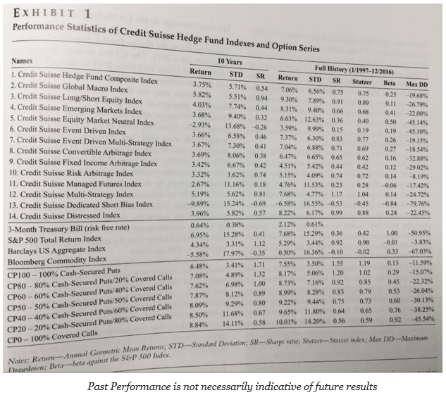 We think this work has been under-researched, yet that is changing with a recent paper in the Journal of Alternative Investments. (See “alternatives to Alternative Assets: Assessing S&P 500 Index Option Strategies as Hedge Fund Replacements” by Wei Ge.) The author compares seven different option strategies on an equity index against 14 different Credit Suisse hedge fund indices that cover all of the major hedge fund strategies. The comparison is done through either beta volatility matching.