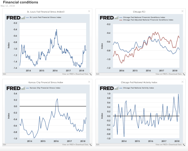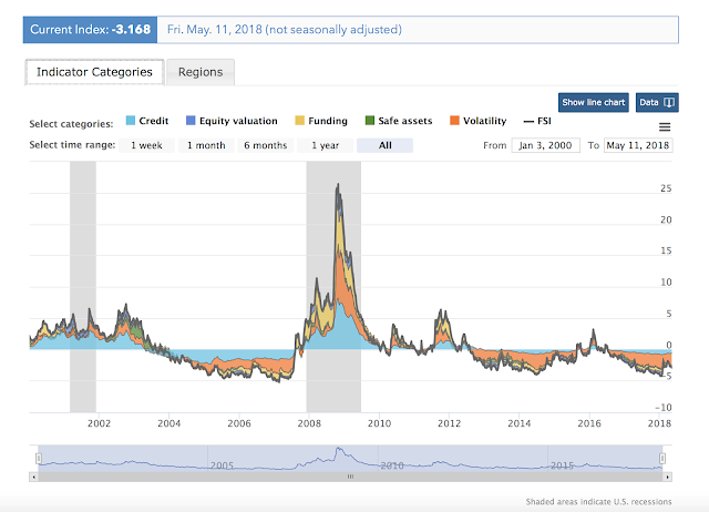 Financial condition indices from Fed banks have not shown a return to the lows at the beginning of the year. These indices overlap with the many of the components of the OFR index but have different weighting schemes as well as different components. The Chicago Fed Financial Conditions (NFCI) Index has the broadest set of data and also uses macroeconomics adjustments for their ANFCI index. These broad indices show a similar pattern to the other stress indices. The Chicago Fed National Activity Index has increased in volatility and has failed from highs but still is in positive territory.
