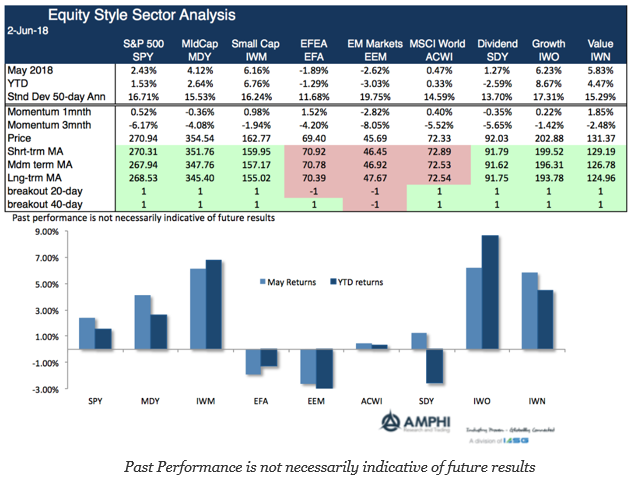 The style gainers for the month were in US centric names, small cap, growth and value. International and emerging market performance declined on dollar strength and capital flight away from political risks focused in specific EU and Latin American countries.