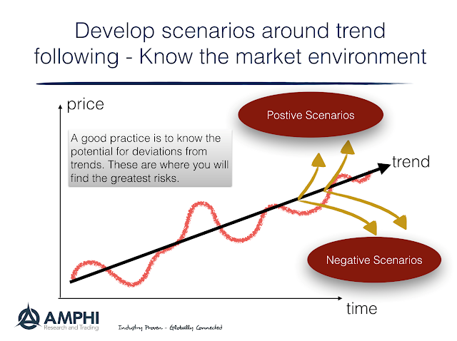 Scenario analysis can tell us something about the potential correlation of risks. A Fed tightening shock will likely have an impact on all emerging market debt.   An oil shock will have an impact on the real economy and equity markets. Consequently, scenario analysis may help change the strategic weights or leverage within a portfolio. Although difficult, the mapping of scenarios to asset classes could be done systematically. Scenarios are a fundamental component of risk analysis. The biggest disconnects between trends and weighted scenarios are also likely the greatest risks. One can follow trends but still engage in scenario analysis to measure potential risks.