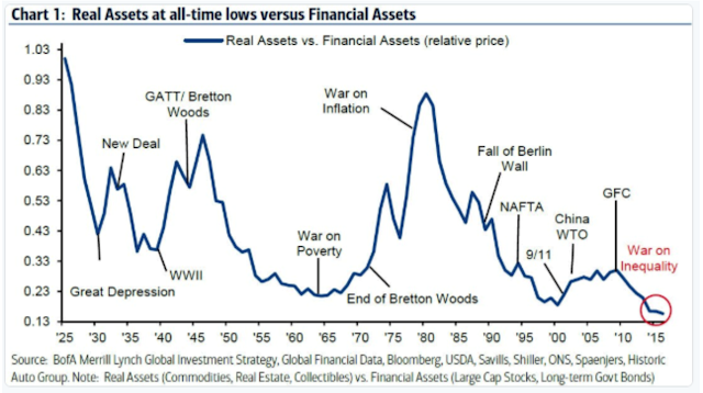 Financial assets are at all time highs versus what is considered real assets; commodities, real estates and collectibles. Real assets usually exploded in relative value during periods of inflation and war when more resources are needed or when commodities are scarce relative to money. The flow of money has moved to financial assets especially those that are related to technologies that do not need capital. The flow of excess money to financial assets and their expected future cash flows exceed demand for real assets that do not immediately generate return but have to be transformed for consumption or usage.