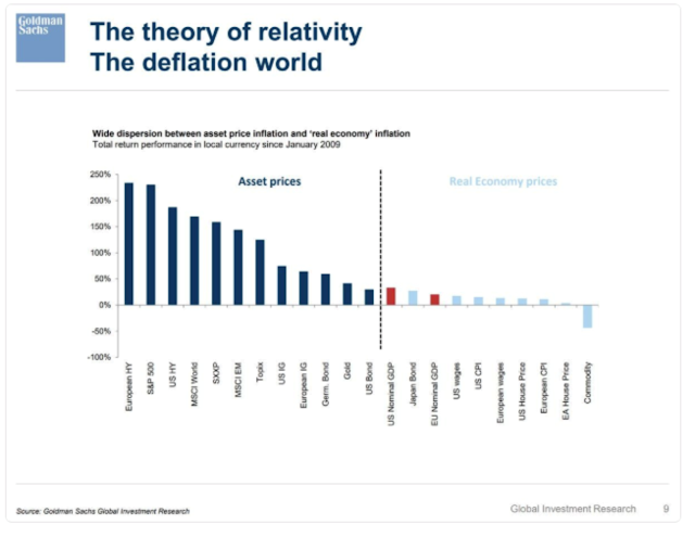 Another way to see this is through comparing asset price inflation and real economy inflation. Real prices have not moved and in the case of commodities have fallen. Financial assets have exploded. The capital gains, dividends, or carry has favored these assets over investing in the real economy. Excess cash has used financial assets as a store of value. This is the collateral used for a levered economy.
