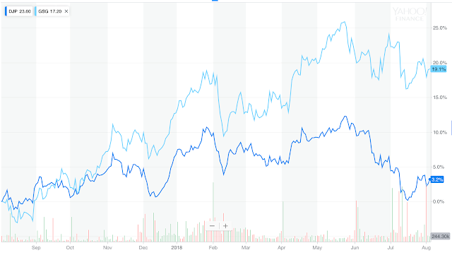 Commodities, as an asset class, have had exciting performance year; well maybe, if you had the right index. A quick look at returns over the last year shows that if you held the SPGSCI index through the GSG ETF, you would have gained a very attractive 19 percent return. If you held the broader-based Bloomberg commodity index (BCOMM) (DJP ETF) you would have received only 3.2%. Both are well-defined indices, but the performance difference would have been in the double digits. This is all based on the weighting of the index. SPGSCI has a 2/3rds weighting in energy while the BCOMM only has a 30 percent energy weighting. If you liked energy, you would have been a star. If you preferred diversity, you would have been made only a slightly positive gain.