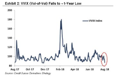 Volatility has fallen since the February vol-shock, but the vol-of-vol shock paints a deeper picture of the calm that has overtaken the equity markets. This same behavior is seen in other asset classes. Given the combination of geopolitical risks, economic uncertainty, and policy changes, should we expect this level of calm? It seems unlikely.