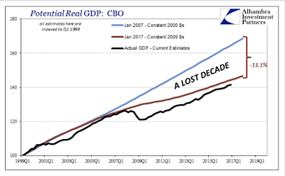 The equity rally is reaching old age and the business cycle has also aged and seems to be reaching a number of highs, but the real GDP gap is still significant. The cost of the Financial Crisis is still being felt in the GDP numbers. Nevertheless, the old adage applies; business and financial cycles don’t die of old age, they are murdered by bad policy choices or a surprise shock.