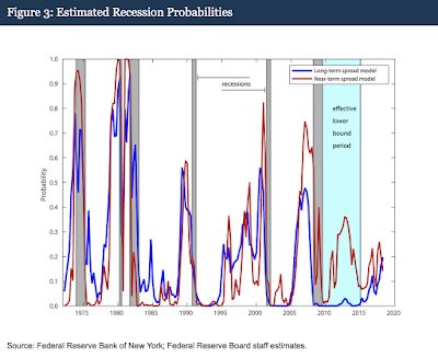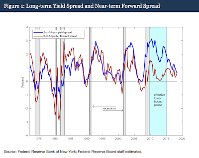There are a number of measure to look at the yield curve signal, so it is important not to be focused on any single curve number; nevertheless, recent work from the Fed suggests that short-term signals may be better than long-term signals. See Fed Notes, (Don’t Fear) The Yield Curve which may be the most current thinking at the Fed. Eric Engstrom and Steven Sharpe find that a short-term forward spread signal does better than a long-term measure like the 2-10-year Treasury spread. The short-term forward spread has better explanatory power.