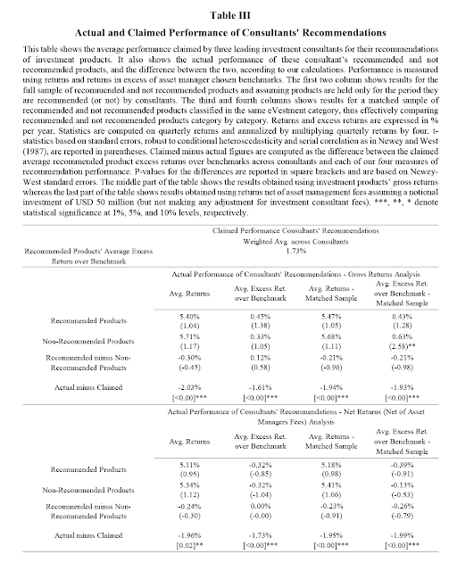 The study used a database of recommendations from the FCA for UK consultants some of which are the biggest in the world. This database has not been available to the public. The conclusions suggest that the consultant recommendations do not outperform non-recommended managers or benchmarks. These results are inconsistent with the claims of the consultants who show outperformance versus selected grouping for comparison. A close look at the methods used for consultant claims suggest that there may be biases in their methodologies.
