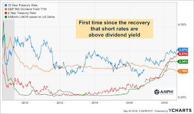 Short-term interest rates are now above dividend yields for the first time since the Financial Crisis. This could be a big deal. Investors can now hold short-term bonds and receive a higher carry return than holding dividend-paying stocks. The cost of holding cash is now less than holding dividend stocks.