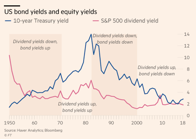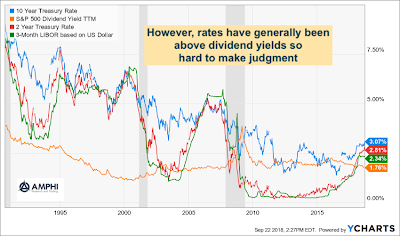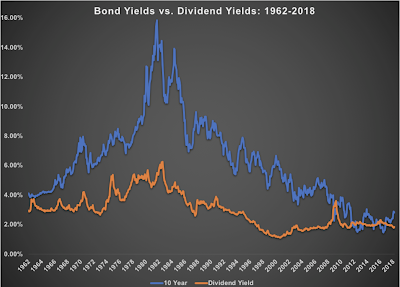 There is a long history of research that suggests that high dividend yields are indicative of cheap stocks and dividend yield are a strong contributor to total return, but we are interested in the relative relationship with yields. This issue is a variation of the old Fed model discussions of richness and cheapness in stocks. The current condition of rates higher divided yields could suggest that stocks are priced high, but we need more historical context.