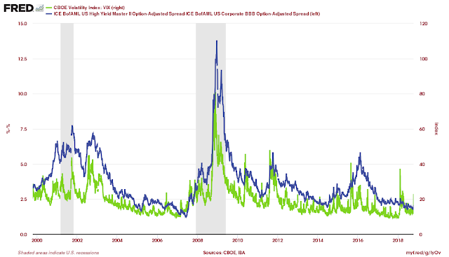 Looking at the spread between high yield and BBB bonds through the BAML bond indices shows that recent volatility spikes have translated into wider spreads. This spread widening on spikes has generally been temporary and revert with volatility declines but longer-term increases in volatility do translate to higher sustained spread levels. Corporate credit may not be as safe as evidenced in recent data if volatility stays higher.