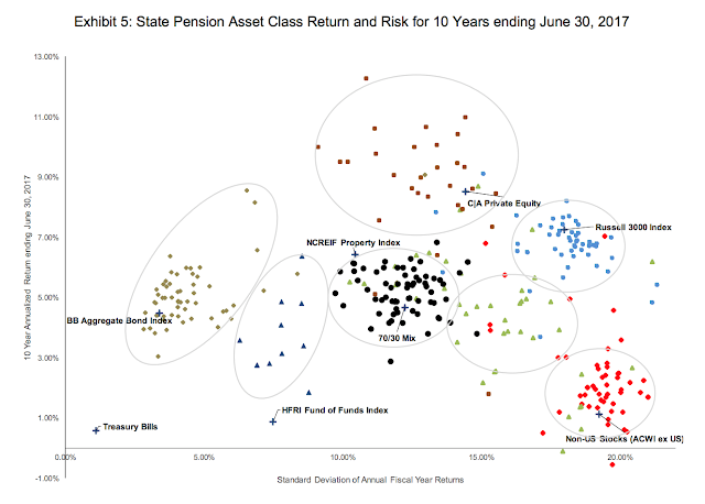 There are still significant funding challenges for state pension funds even with the bull market over the last decade. The consulting firm, Cliffwater, analyzed state pension performance over the last decade in the recent review. State pensions have not been able to meet their actuarial return assumptions. This under performance places them further below their funding requirements. These funding shortfalls exist even though most funds beat a 70/30 stock bond benchmark. There is also strong return dispersion across states with the best states generating returns 25 percent over the median state return and the worst states over 30 percent lower than the median.