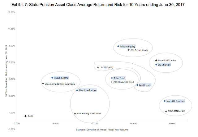 So where are states going to get returns over the next few years to close the funding gap and hit actuarial assumptions? There may not be much room for extra return. Skill as measured by extra return versus a benchmark is possible, but the difference between median and benchmark is usually inside 100 basis points, so it is unlikely that pensions will be able to pick better managers to get more returns.