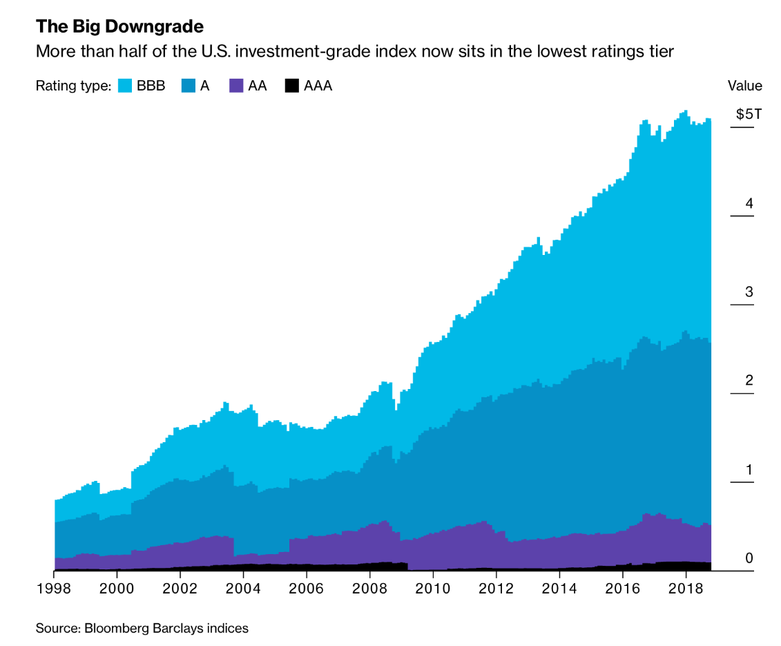 The potential risk for credit is always front and center with any discussions about a new financial crisis but usually the conversation stops there. There is less discussion on what is going on under the hood with respect to credit markets. A recent Bloomberg story highlighted some of the issues that should frighten any investor, see “A $1trillion dollar powder keg threatens the corporate bond market”. This article outlines one scary feature of the added debt; the junk bond leverage for some investment grade firms. This article suggests that rating agencies are not doing their job. We have seen this story before with rating agencies and structured finance. The story implies that when the next macro shock occurs, there are some very large issuers who will see significant declines.