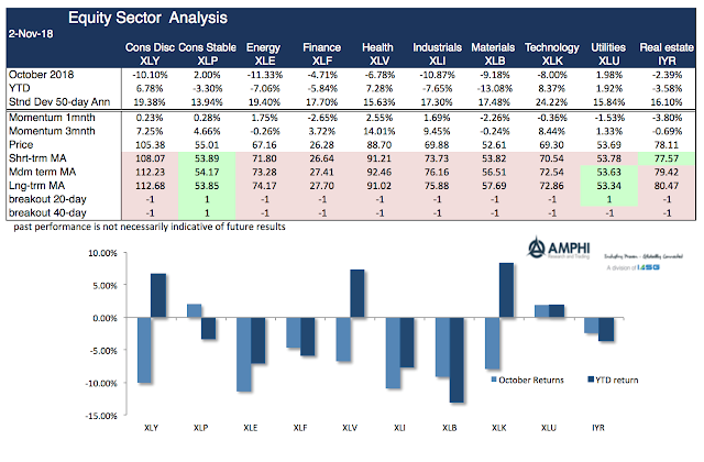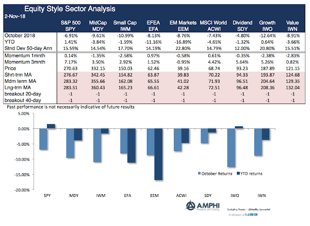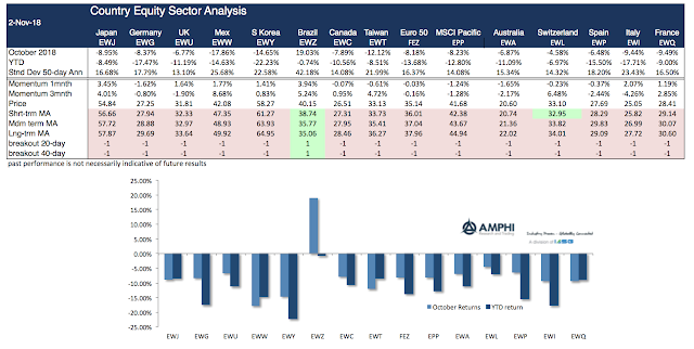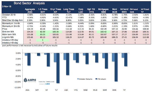 The losses in October are well-known. Now the question is whether these down moves will continue across styles, sectors, country indices, and bonds. The answer with few exceptions is the same. Market trends are pointed down and volatility is higher. For equity styles, short, medium and long-term trends are all pointing down. For market sectors, the only positive trend is with consumer stables, utilities, and real estate; the more defensive sectors. For country equity indices, the only strong positive standout was Brazil in reaction to their presidential election. For bonds, short-term Treasuries offer some protection, but the longer-term trends are all down.