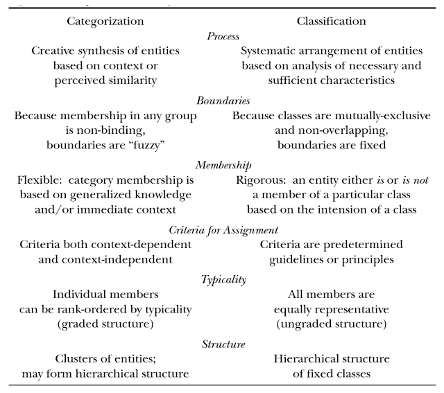 There can be a distinction between categorization and classification because most things do not fit into simple boxes. Classification is more formal and systematic based on rules. Categorization uses boundaries for similarities. See Elin K Jacob “Classification and Categorization: A Difference That Makes A Difference”. The structure of categories and classification are not often discussed and just assumed, yet the choices are important.