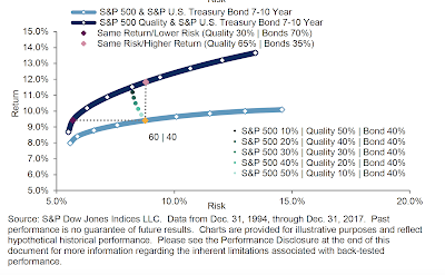 The gains from holding a US focused large cap equity and diversified bond allocation and not being further diversified across investment risk premia styles and international equity and bonds is a function of the recent performance and not special characteristics. Performance for both stocks and bonds is now off from the norms of the last decade. The correlation between stocks and bonds is moving higher. Volatility across equities and bonds is also trending higher. Something more defensive may be helpful.