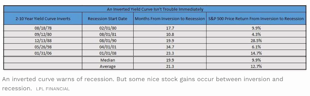 From LPL, the period between inversion and recession is associated with positive equity gains.