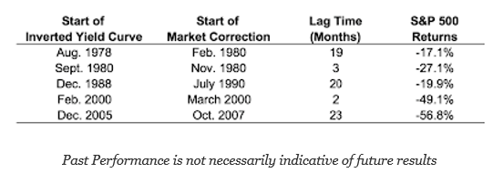 - There is a long but variable lag between a yield curve inversion and the start of a correction.