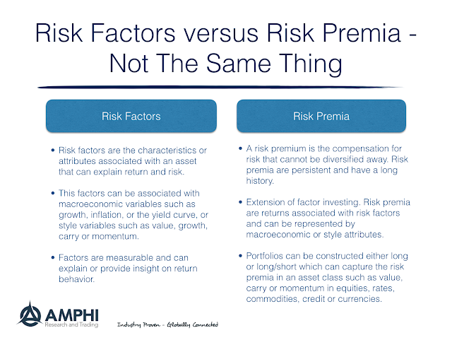 There is a difference between risk factors and risk premia. This may be viewed as a subtle distinction, but it is important to think about the differences. Factors explain the return attributes of an asset. Those attributes may be either style or macroeconomic factors. Factors provide a description of what drives returns. A risk premium is what an investor receives for taking-on the risk associated with a factor. A risk premium is compensation for non-diversified risk which can come in the form of a style or a macro factor. A factor is a measurement of a characteristic. A premium is compensation for holding a characteristic. Investors want to be paid a premium for a persistent repeatable factor.