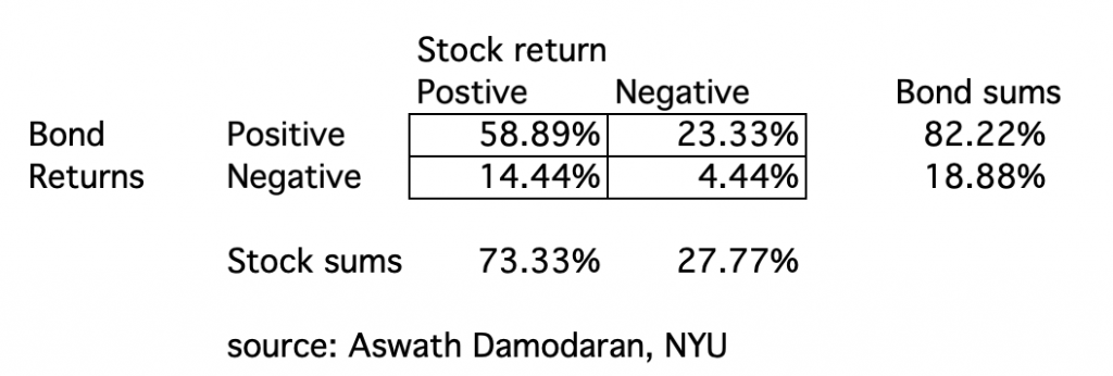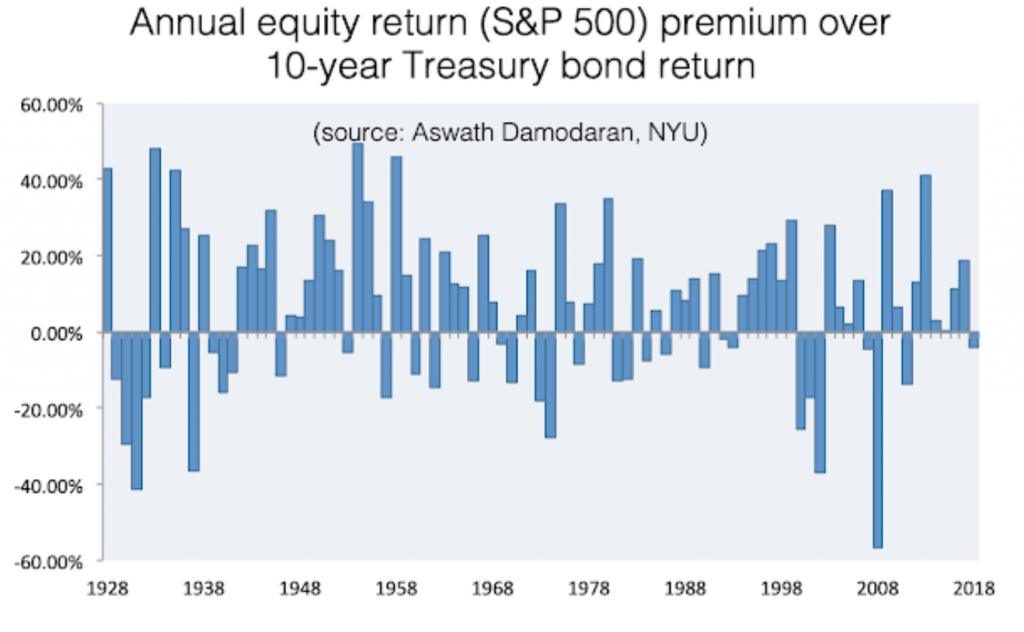 Additionally, the equity return premium over bonds is usually large. The arithmetic average is about 6.25 percent with a standard error of 2.25 percent.