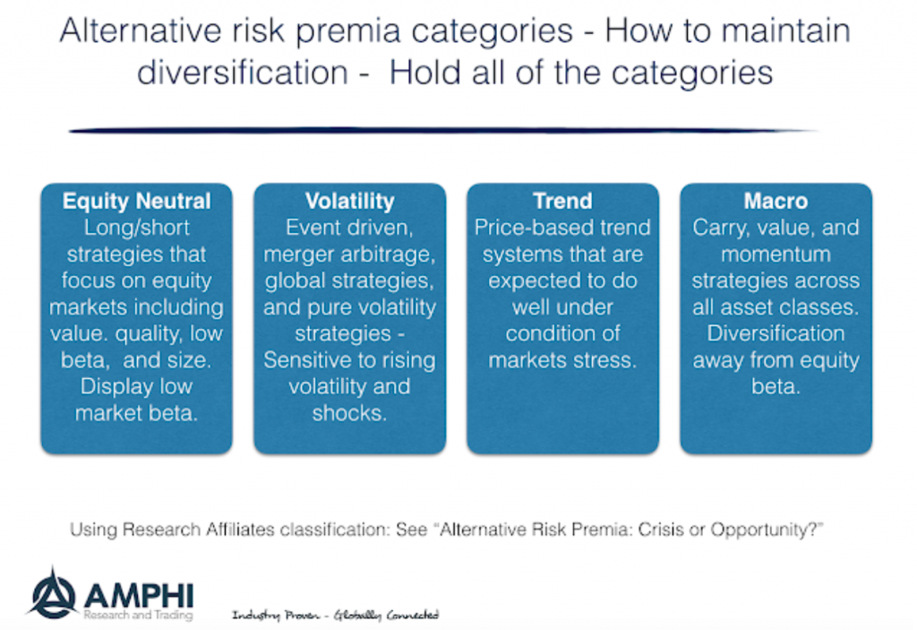 Research Affiliates breaks alternative risk premia into four major categories: equity market neutral, volatility, trend, and macro. Investor should consider ensuring diversification across these categories other classification schemes.