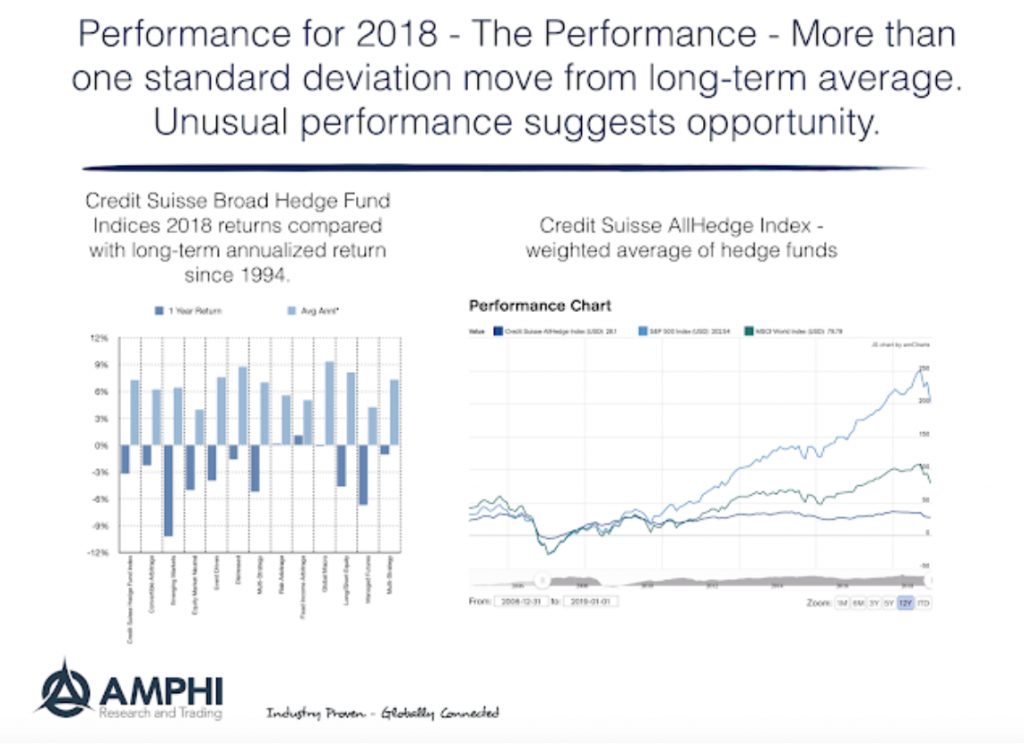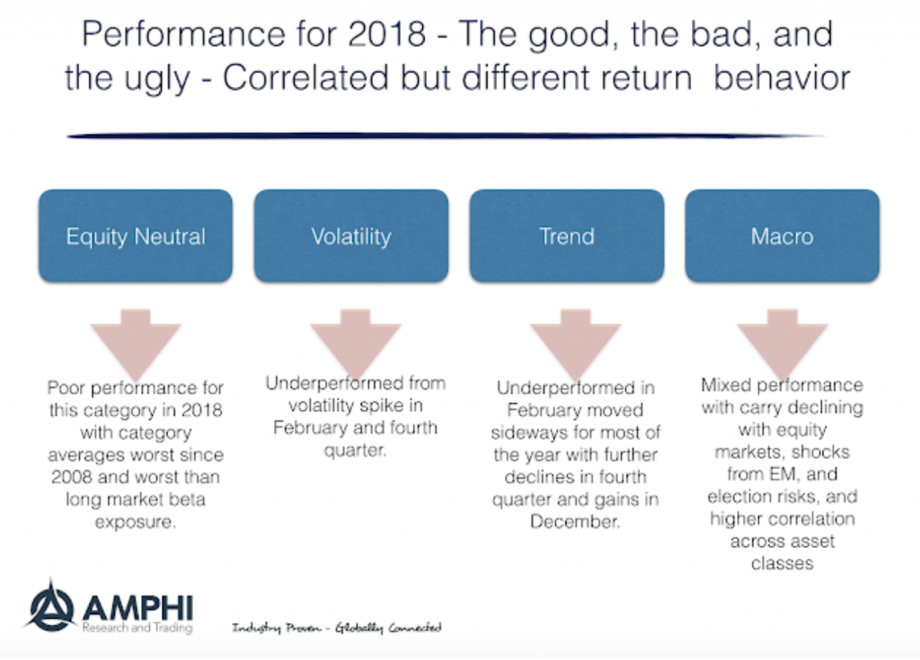 Each of these categories underperformed in 2018, but for different reason. The equity neutral category showed increased correlation with market beta and was dragged lower by dislocations in the value style sector. The volatility category was hurt by spikes in volatility during February and the fourth quarter. Trend was harmed by volatility spikes and limited or choppy trends until December. Macro strategies that have an equity bias like carry were hurt during the year and shocks to both global and emerging markets negatively affected overall performance.