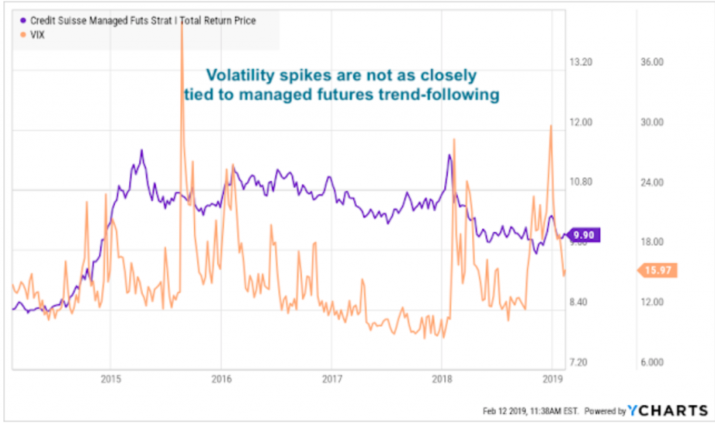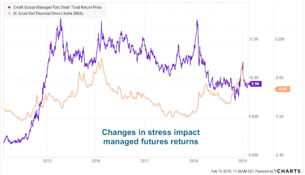 While there is a connection between equity returns and spikes in volatility, the link between volatility and managed futures is less clear. However, overall financial stress may be a better measure of when returns will be above normal. Financial stress includes volatility but is a broader concept that looks at a wider range of indicators.