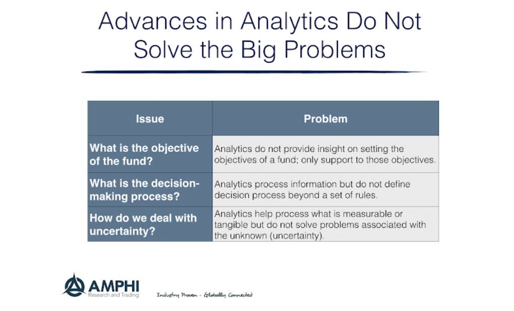 There is no question that given the large amounts of data and the high rewards, the greater use of analytical tools is obvious. The quant revolution has started before the Financial Crisis and may be more advanced than other industries. The problem is not the use of these tools but the clarity of the investment goals. Most will just say that the analytics are supposed to help increase returns, but that does not address the true problem. How do you make better investment decisions in an uncertain world?