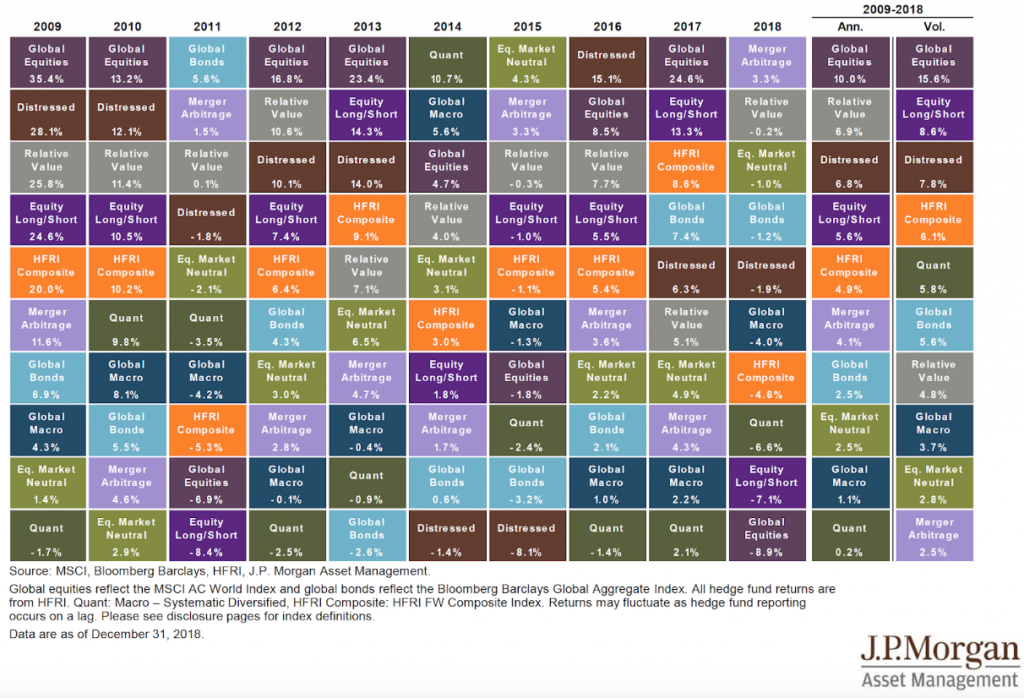 All hedge funds are not created equal as the return box chart shows for the post Financial Crisis period. There is a significant amount of dispersion across hedge fund styles. Over the period 2009-2018, the difference between the best and worst hedge fund category is almost 7 percent after we account for global equities and bonds.