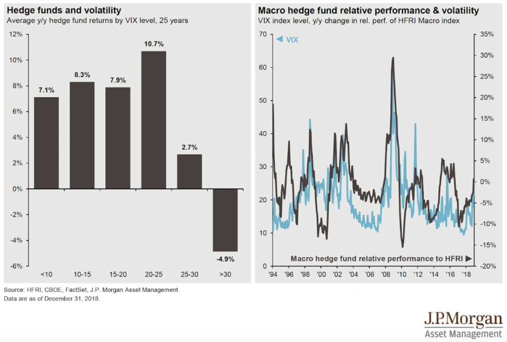 Hedge funds have a “Goldilocks” relationship with volatility. High volatility is not good for returns, but low volatility seems to limit the return opportunities. The average VIX over this period was below 20 percent so slightly higher volatility is good, but once volatility get above 25% there is a decline in performance. As volatility rises above a threshold, the chance for making investment mistakes increases. However, one way to protect against volatility is to look at investing in global macro strategies that will generate an excess return relative other hedge funds when the VIX index spikes.
