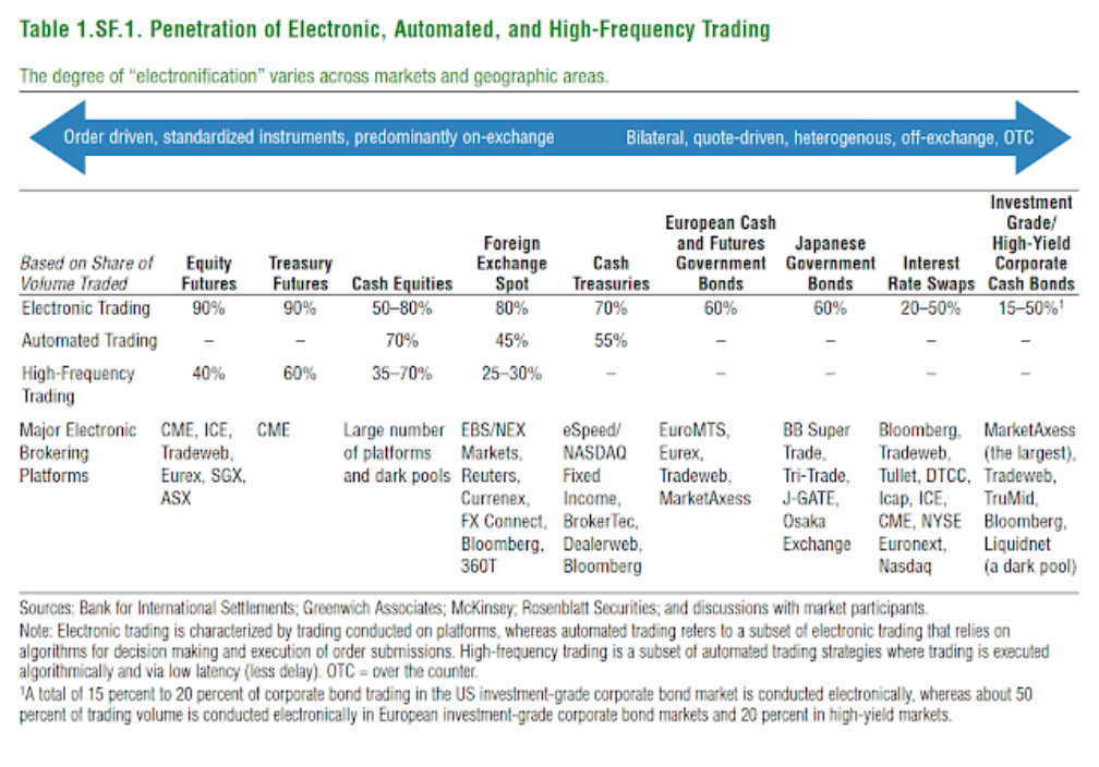 Two issues jump out when thinking about market liquidity. One, the liquidity market structure has changed radically since the Financial Crisis. It cannot serve all investors wanting to sell in a crisis. High frequency and electronic trading make the liquidity in a crisis more fragile, and the spread of technology is unequal. The trading future has come sooner for some. Two, the concept of market liquidity is fluid. Some asset classes are more liquid than others, and market liquidity last year was not the same as this year.